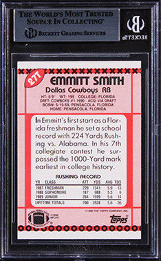 This Autographed 1990 Topps Traded #27T Card with the inscription of "HOF 2010" has been Personally Signed by Emmitt Smith of the Dallas Cowboys. This item is 100% Authentic, it comes slabbed and authenticated by Beckett Authentication Services. The authenticity can be verified on Beckett Authentication Services website.
