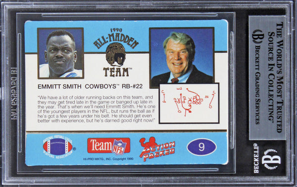 This Autographed 1990 Action Packed All-Madden #9 Card has been Personally Signed by Emmitt Smith of the Dallas Cowboys. This item is 100% Authentic, it comes slabbed and authenticated by Beckett Authentication Services. The authenticity can be verified on Beckett Authentication Services website.
