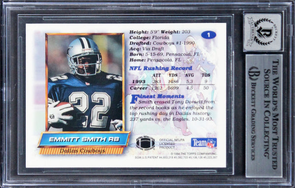 This Autographed Auto Graded Gem Mint 10! 1994 Finest #1 Card has been Personally Signed by Emmitt Smith of the Dallas Cowboys. This item is 100% Authentic, it comes slabbed and authenticated by Beckett Authentication Services. The authenticity can be verified on Beckett Authentication Services website.