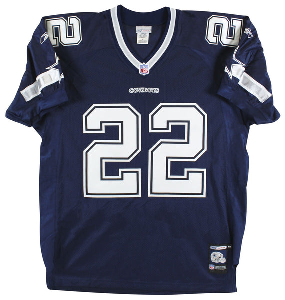 This Autographed Navy Blue Reebok Jersey has been Personally Signed by Emmitt Smith of the Dallas Cowboys. This item is 100% Authentic to include a Certificate of Authenticity (COA) / hologram by Beckett Authentication Services. This is a BAS Witnessed Protection Program item which means a Beckett Authentication Service representative was present when this item was being signed. This is a stock item. We conducted an autograph signing with Emmitt Smith and we have several of these available. The one you will receive will be of equal quality to the one pictured. This item can be verified through BAS Witnessed. This is a X-Large sized Jersey.