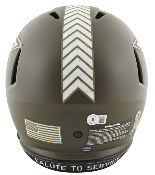 This Autographed Alternate Salute To Service Riddell Authentic Full Size Speed Proline Helmet has been Personally Signed by Emmitt Smith of the Dallas Cowboys. This item is 100% Authentic to include a hologram by Beckett Authentication Services. This item may come with the new Beckett Authentication hologram that has a scannable QR code rather than the traditional COA. If you would like to have a COA, you are welcome to reach out to Beckett for a printed certification once you receive your item. This is a BAS Witnessed Protection Program item which means a Beckett Authentication Service representative was present when this item was being signed. We conducted an autograph signing with Emmitt Smith where multiples of the same item were signed. While the photographs are representative of this item, the size, placement and strength of the signature may vary. Each item is hand signed, therefore, each autograph is unique. This item can be verified through BAS Witnessed.