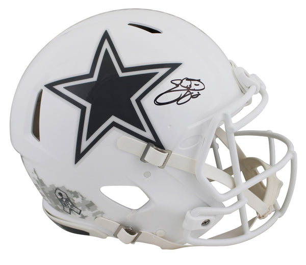 This Autographed Alternate 2024 Salute To Service III Riddell Authentic Full Size Speed Proline Helmet has been Personally Signed by Emmitt Smith of the Dallas Cowboys. This item is 100% Authentic to include a hologram by Beckett Authentication Services. This item will come with an affixed Beckett Authentication Services (BAS) authentication sticker, which includes a scannable QR code to verify authenticity. Please note that Beckett no longer provides serial-numbered COA cards, and the attached BAS sticker will serve as the complete authentication for this item. This is a BAS Witnessed Protection Program item which means a Beckett Authentication Service representative was present when this item was being signed. We conducted an autograph signing with Emmitt Smith where multiples of the same item were signed. While the photographs are representative of this item, the size, placement and strength of the signature may vary. Each item is hand signed, therefore, each autograph is unique. This item can be verified through BAS Witnessed.