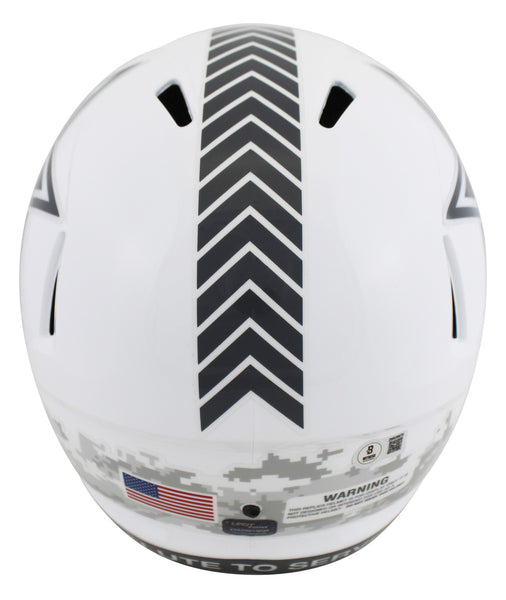 This Autographed Alternate 2024 Salute To Service III Riddell Full Size Speed Rep Helmet has been Personally Signed by Emmitt Smith of the Dallas Cowboys. This item is 100% Authentic to include a hologram by Beckett Authentication Services. This item will come with an affixed Beckett Authentication Services (BAS) authentication sticker, which includes a scannable QR code to verify authenticity. Please note that Beckett no longer provides serial-numbered COA cards, and the attached BAS sticker will serve as the complete authentication for this item. This is a BAS Witnessed Protection Program item which means a Beckett Authentication Service representative was present when this item was being signed. We conducted an autograph signing with Emmitt Smith where multiples of the same item were signed. While the photographs are representative of this item, the size, placement and strength of the signature may vary. Each item is hand signed, therefore, each autograph is unique. This item can be verified through BAS Witnessed.