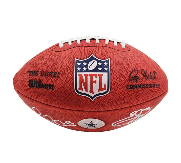 A Dallas Cowboys Wilson Cowboys Logo NFL Football hand signed by Emmitt Smith and Michael Irvin. The item and signature are in excellent condition - Emmitt is a former NFL running back. He was inducted into the Pro Football Hall of Fame in 2010, 3x Super Bowl Champion, Super Bowl MVP (XXVIII), 8x Pro Bowler, 4x First-Team All Pro. Michael played college football at the University of Miami, and then for the Dallas Cowboys. He is a 3x SB Champ & 5x Pro Bowler. AUTHENTICATION: The item is accompanied by a PSA Certificate of Authenticity - PSA Serial Numbered and Databased Hologram