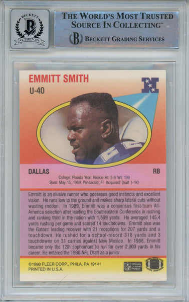 Emmitt Smith Autographed 1990 Fleer U-40 Rookie Card Beckett 10 Slab 39275 The number in the listing title is just an inventory sku for our records and is not the authentication number. This is the exact item that you will receive so please see pictures for condition. This is a trading card that was personally autographed by Emmitt Smith. This has been professionally slabbed by Beckett Authentication Services (BAS) and includes a certificate of authenticity from Denver Autographs.