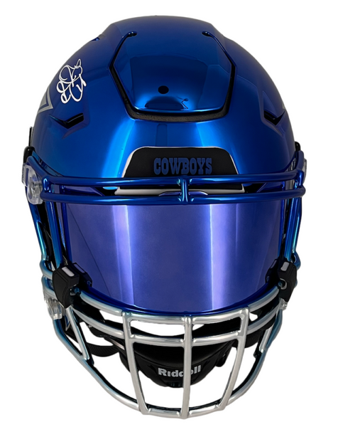 Emmitt Smith Autographed Dallas Cowboys Custom Blue Chrome SpeedFlex Authentic Helmet Beckett WitnessedThis Dallas Cowboys authentic Chrome Speed Flex helmet has been personally hand-signed by Emmitt Smith. This helmet must be seen in person to truly appreciate. It comes with an individually numbered, tamper-evident hologram from Beckett Authentic. To ensure authenticity, the hologram can be reviewed online. This process helps to ensure that the product purchased is authentic and eliminates any possibility of duplication or fraud.Also included is a custom visor and 3D bumpers. This helmet will be the centerpiece of your collection.
