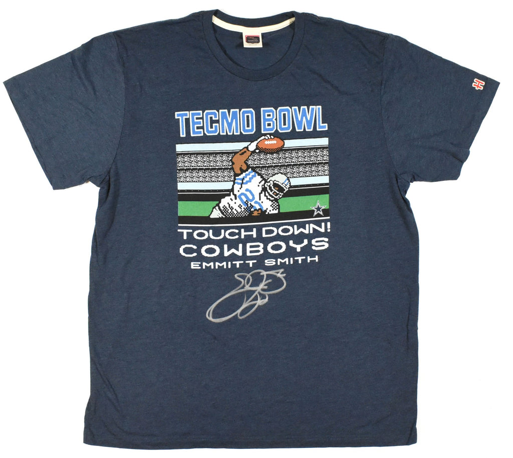 This is a hand autograph of Emmitt Smith of the Dallas Cowboys on a Homage Tecmo Bowl T-Shirt. Size XL. This item has a Beckett Witnessed Authentication, which comes with a Beckett numbered sticker hologram and a QR Code for verification. You can view this item on the Beckett Authentication website. It was signed either at a public autograph appearance or a private signing. This is a stock photo of the item. Although you may not receive this exact item, the item you receive is virtually identical and brand new in great shape. Size is XL. This is a hand autograph of Emmitt Smith of the Dallas Cowboys on a Homage Tecmo Bowl T-Shirt. Size XL. This item has a Beckett Witnessed Authentication, which comes with a Beckett numbered sticker hologram and a QR Code for verification. You can view this item on the Beckett Authentication website. It was signed either at a public autograph appearance or a private signing. This is a stock photo of the item. Although you may not receive this exact item, the item you receive is virtually identical and brand new in great shape. Size is XL.