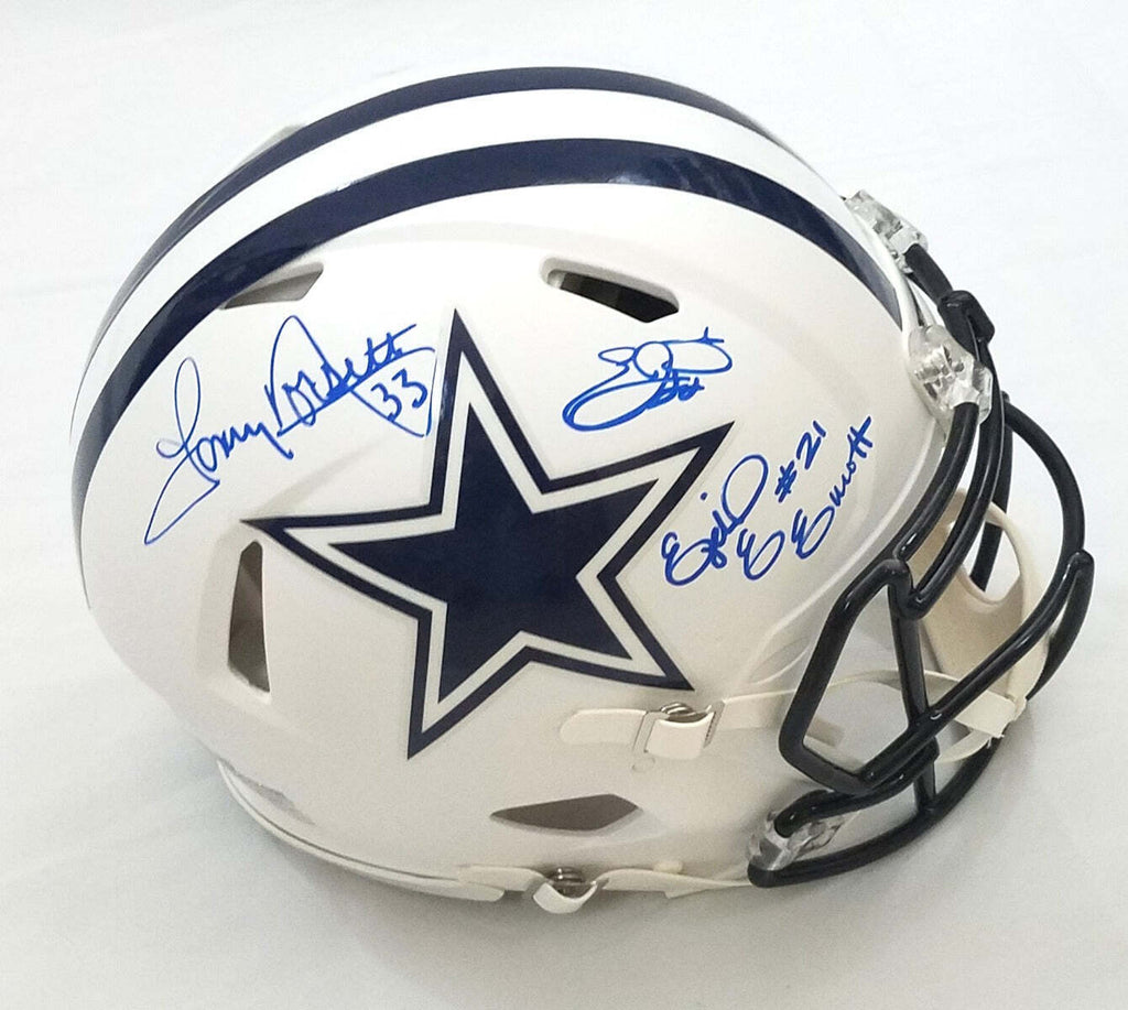 Emmitt Smith & Ezekiel Elliott Dorsett Signed Cowboys Flat White Auth Helmet BAS
