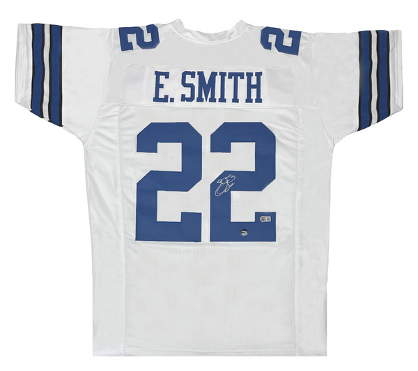 This custom white jersey has been personally hand-signed by Emmitt Smith of the Dallas Cowboys. It comes with an individually numbered, tamper-evident hologram from Beckett Authentic. To ensure authenticity, the hologram can be reviewed online. This process helps to ensure that the product purchased is authentic and eliminates any possibility of duplication or fraud.