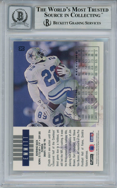 Emmitt Smith Signed 1994 Skybox Impact #63 Trading Card Beckett 10 Slab 35092 The number in the listing title is just an inventory sku for our records and is not the authentication number. The item pictured is a stock photo unless otherwise noted. This is a football trading card that was personally autographed by Emmitt Smith. This has been professionally slabbed by Beckett Authentication Services (BAS) and includes a certificate of authenticity from Denver Autographs.