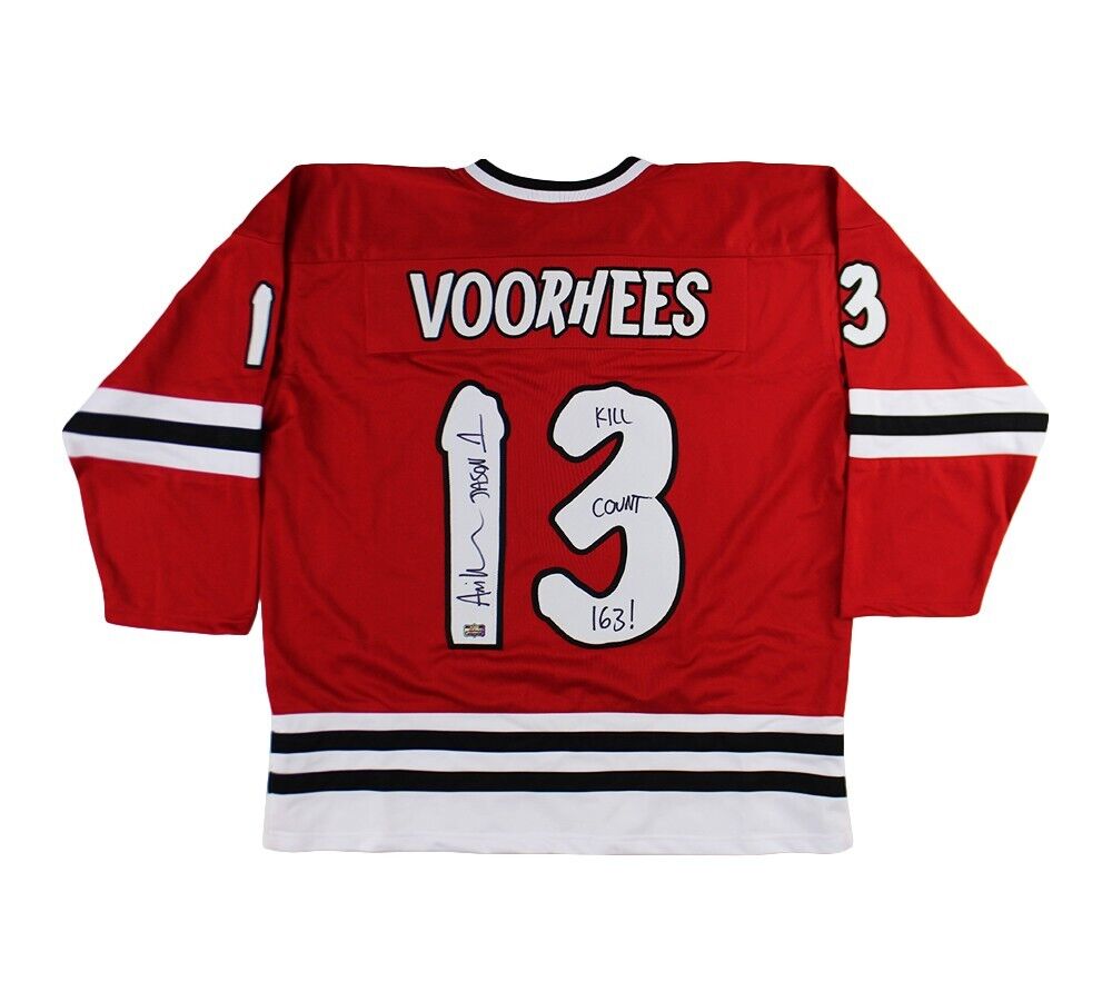 A Friday the 13th Custom Red Jersey hand signed by Ari Lehman. The item and signature are in excellent condition. In addition to signing his name, Ari also inscribed "Jason 1" & "Kill Count 163" on the item. Ari is an actor, performing artist & composer. He is known for playing the child Jason Voorhees in the Friday the 13th horror movies. AUTHENTICATION: Your item is tagged with a SmarTag powered by Prova Technology, which gives you digital access to your items authentication records, which includes a proof picture from the signing.