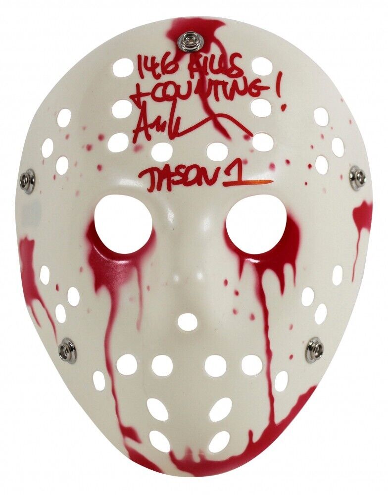 "Friday the 13th" Jason Voorhees replica Bloody Mask. Hand-signed and inscribed by Ari Lehman (Jason Voorhees).The autograph includes an official Beckett Authentication Services serially numbered hologram and QR code card for authenticity purposes. The signing of this item was witnessed by Beckett.Authentication: Beckett Hologram and QR Code card