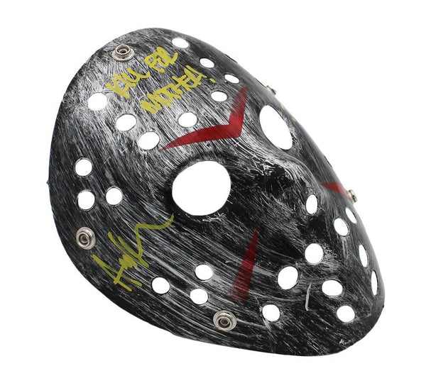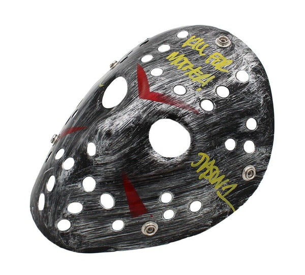 A Friday the 13th Silver Costume Mask hand signed by Ari Lehman. The item and signature are in excellent condition. In addition to signing his name, Ari also inscribed "Jason 1" & "Kill for Mother" on the item. Ari is an actor, performing artist & composer. He is known for playing the child Jason Voorhees in the Friday the 13th horror movies. AUTHENTICATION: Your item is tagged with a SmarTag powered by Prova Technology, which gives you digital access to your items authentication records, which includes a proof picture from the signing.