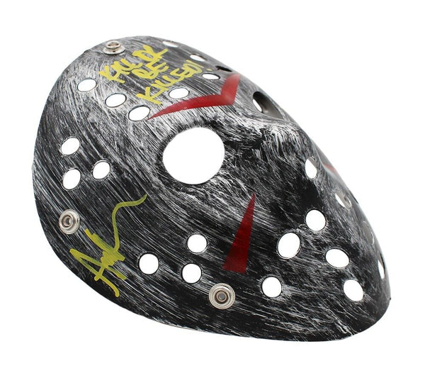 A Friday the 13th Silver Costume Mask hand signed by Ari Lehman. The item and signature are in excellent condition. In addition to signing his name, Ari also inscribed "Jason 1" & "Kill or Be Killed" on the item. Ari is an actor, performing artist & composer. He is known for playing the child Jason Voorhees in the Friday the 13th horror movies. AUTHENTICATION: Your item is tagged with a SmarTag powered by Prova Technology, which gives you digital access to your items authentication records, which includes a proof picture from the signing.
