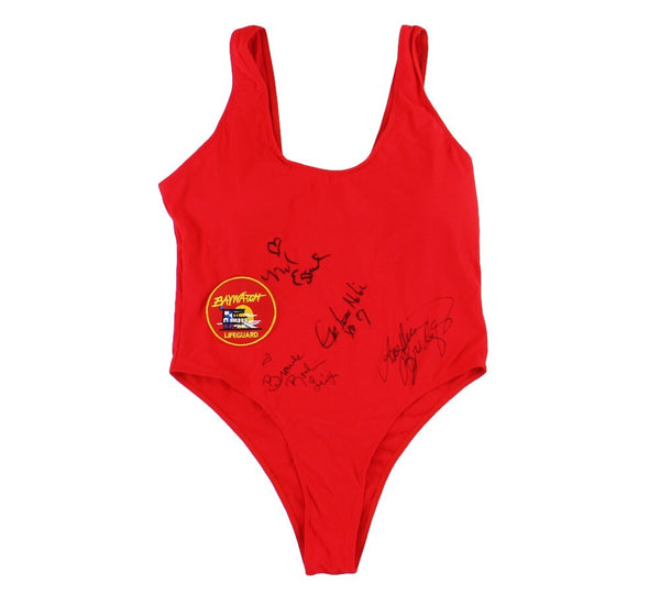 A Baywatch Medium Red Bathing Suit hand signed by Gena Lee Nolin, Nicole Eggert, Angelica Bridges, and Brande Roderick. The item and signatures are in excellent condition. Baywatch was a globally popular TV series that aired from 1989 to 2001, following the dramatic rescues and lives of California lifeguards, famously starring David Hasselhoff and Pamela Anderson. It became the most watched show worldwide in the 1990s. AUTHENTICATION: The item is accompanied by a JSA Certificate of Authenticity - JSA Serial Numbered Hologram -