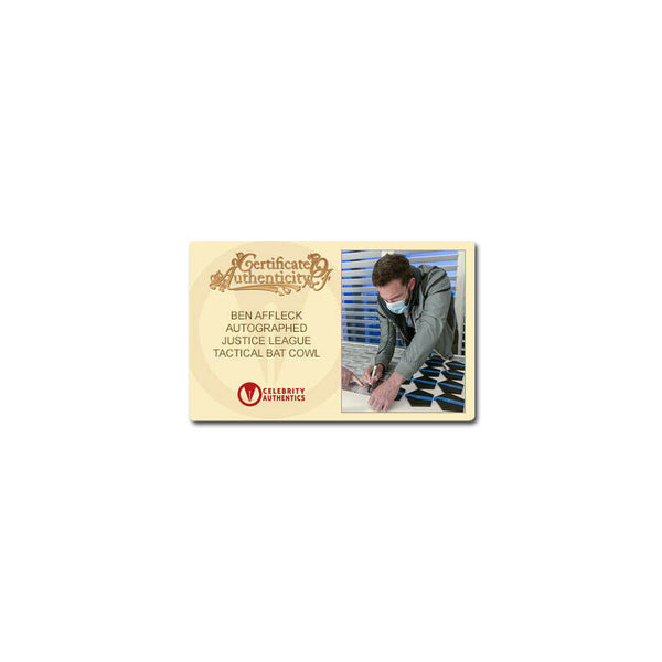 This Batman v Superman: Dawn of Justice Batman Cowl has been personally hand-signed by Gotham's Caped Crusader himself, Ben Affleck during his signing with Celebrity Authentics. Recreated in 1:1 life-size scale this highly detailed, wearable cowl stands about 17" tall, 13" wide, 8" in depth and comes complete with an acrylic display case. Affixed with Celebrity Authentics serial numbered hologram and includes a Celebrity Authentics Certificates of Authenticity featuring a picture of Ben signing Cowl.* Please note this item is only able to be shipped within the contiguous United States. * Please note: with multiples signed by the actor, a sample photo is used from stock to represent what you will receive. Exact autograph size and placement may vary.