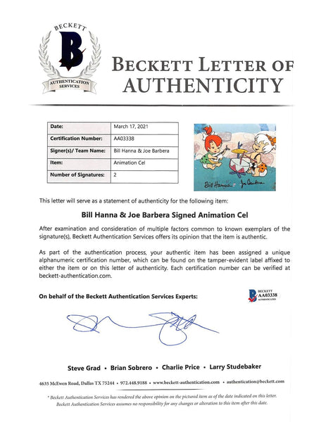 This Autographed & Framed 9.5X12.5 Animation Cel Limited Edition #73/300 has been Personally Signed by Bill Hanna & Joe Barbera of The Flintstones. This item is 100% Authentic to include a Certificate of Authenticity (COA) / hologram by Beckett Authentication Services. The authenticity can be verified on Beckett Authentication Services website. This item has been professionally framed to overall dimensions of approximately 18 x 21 inches.