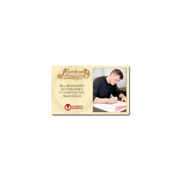 Celebrity Authentics is the exclusive autograph partner of Bill Skarsgard. Please be aware most other online autographs purported to be Mr. Skarsgard's are forgeries. Mr. Skarsgard has only signed with Celebrity Authentics so be sure the item you choose is affixed with the Celebrity Authentics Authentication Hologram for his genuine signature.This extremely rare IT Chapter II Pennywise 16x24 Limited Edition Screen Print featuring the artwork of Ann Bembi has been personally autographed by the Dancing Clown himself, Bill Skarsgard during his exclusive signing with Celebrity Authentics. Hand-numbered and printed on luxurious rag paper, the colors and depth of Ann's artwork is magnificently captured! Defeated by members of the Losers' Club, the evil clown Pennywise returns 27 years later to terrorize the town of Derry, Maine, once again. Now adults, the childhood friends have long since gone their separate ways. But when people start disappearing, Mike Hanlon calls the others home for one final stand. Damaged by scars from the past, the united Losers must conquer their deepest fears to destroy the shape-shifting Pennywise -- now more powerful than ever. With very few prints personally hand-signed by Bill, this very rare and impressive piece ships affixed with Celebrity Authentics serial-numbered Authentication hologram, including Celebrity Authentics Certificate of Authenticity featuring picture of Bill signing the print. Please note: with multiples signed by the actor, a sample photo is used from stock to represent what you will receive. Exact autograph size and placement may vary.