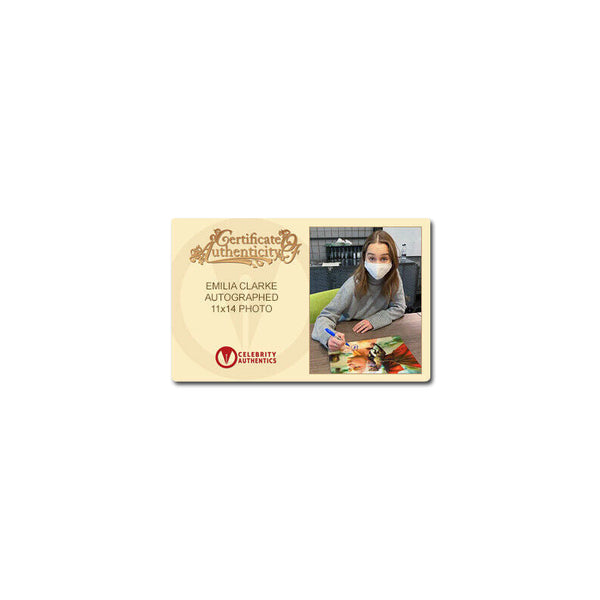 This 11x14 photo of Daenerys Targaryen from Game of Thrones has been personally hand-signed by Emilia Clarke during her signing with Celebrity Authentics. This stunning photo ships affixed with Celebrity Authentics serial-numbered and tamper evident Authentication Hologram and includes Celebrity Authentics Certificate of Authenticity featuring picture of Emilia signing photo. Please note: with multiples signed by the actor, a sample photo is used from stock to represent what you will receive. Exact autograph size and placement may vary.