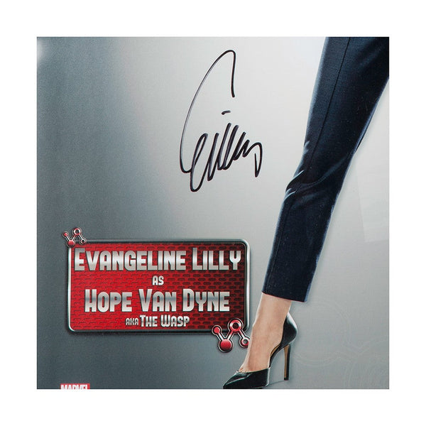 The 12th movie in the Marvel Cinematic Universe franchise, Ant-Man opened in the summer of 2015 to rave reviews and high-grossing sales. The superhero film featured a character by the name of Hope van Dyne, played by Canadian actress Evangeline Lilly. Appearing as Hope Pym in Marvel comic books, she is the daughter of Hank Pym and Janet van Dyne. She takes her mother's maiden name in the film as she is estranged from her father. When Pym Technologies CEO Darren Cross attempts to develop and sell a deadly weapon based on her father's Ant-Man suit, she reunites with Hank. Together, along with Scott Lang (Paul Ruud) taking on the role as the new Ant-Man, they are able to stop Cross. Pym is offered her mother's suit in a scene during the credits of Ant-Man and will become the new Wasp in the 2018 film Ant-Man and the Wasp. Lilly has signed this limited edition (100) designed Ant-Man Hope van Dyne 16" x 20" image in black paint pen. Her signature is deemed authentic by virtue of Upper Deck Authenticated's Five Step Process.