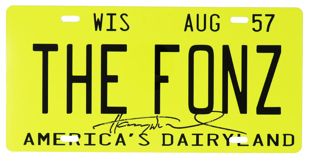 Henry Winkler signed The Fonz Wisconsin yellow license plate. Item comes with a Schwartz Sports Memorabilia numbered tamper-proof hologram and Certificate of Authenticity which can be verified online. **Autograph is slightly imperfect, details can be viewed in image. Item is sold as is.**