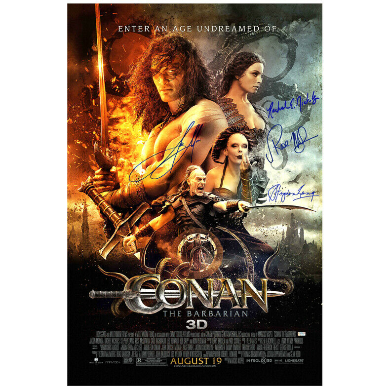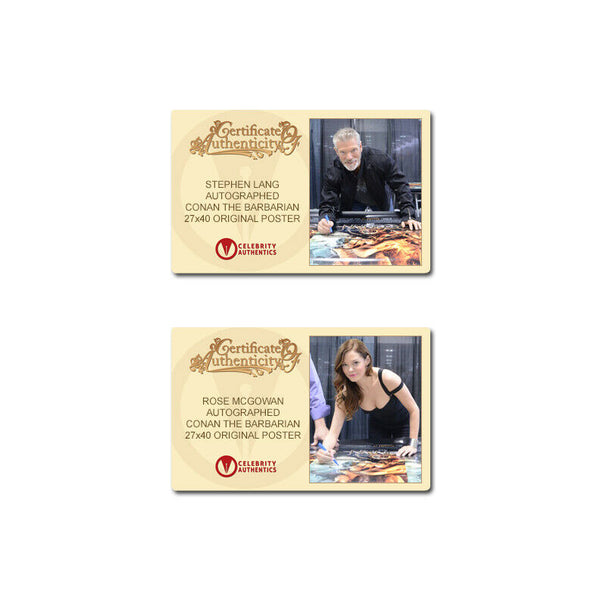 This Original Conan the Barbarian 27x40 Double-Sided Movie Poster has been personally hand-signed by Jason Momoa (Conan), Rachel Nichols (Tamara), Rose McGowan (Marique) and Stephen Lang (Khalar Zym) during their signings with Celebrity Authentics. A warrior sets off to get revenge on the evil warlord who attacked his village and murdered his father when he was a boy in this action adventure film. Item ships affixed with the Celebrity Authentics serial-numbered and tamper evident Authentication Hologram and includes Celebrity Authentics Certificates of Authenticity featuring a picture of each signing poster. Please note: with multiples signed by the actor, a sample photo is used from stock to represent what you will receive. Exact autograph size and placement may vary.