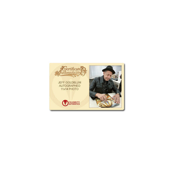 This 11x14 beautiful photo from Jurassic Park has been personally hand-signed by Jeff Goldblum during his signing with Celebrity Authentics. Item ships affixed with Celebrity Authentics serial-numbered and tamper evident Authentication Hologram and includes Celebrity Authentics Certificate of Authenticity featuring picture of Jeff signing photo.Photo is meticulously dry mounted and framed using acid free backing and mat boards with white core for the finest in presentation. UV protective glass with precision cut moulding are used for smooth, clean frame edges, hand assembled in our studio. Additionally, a protective back cover is used to seal the piece with corner bumpers applied to protect your walls, providing adequate air flow. A hanger is affixed to complete the finished collectible. Each framed photo is carefully wrapped for shipping with double protective corners and cushioning to help ensure the item's safe arrival. Celebrity Authentics Framing Studios - acclaimed as the industry's finest! Please note: with multiples signed by the actor, a sample photo is used from stock to represent what you will receive. Exact autograph size and placement may vary.