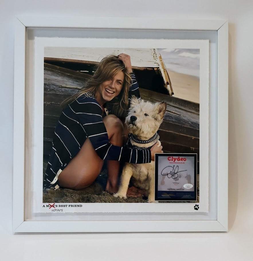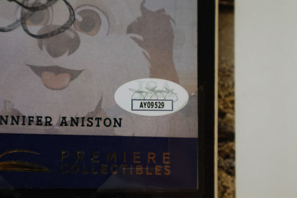 Jennifer Aniston Autographed "Clydeo" Card with Poster - Framed Display Own a rare piece of Hollywood memorabilia featuring Jennifer Aniston's authentic signature on a unique "Clydeo" card, professionally framed alongside a vibrant poster showcasing America's sweetheart. Product Features: Authentic Jennifer Aniston Signature: Hand-signed "Clydeo" card by the beloved actress JSA Certificate of Authenticity: Verified genuine autograph with tamper-proof authentication Professional Framing: Museum-quality 16x20 frame ready for display Dual Display: Features both the signed card and complementary poster Hollywood Icon: Celebrates one of television and film's most beloved stars Investment Grade: Rare collectible from the "Friends" and "Morning Show" star About Jennifer Aniston From her iconic role as Rachel Green on "Friends" to her acclaimed performances in "The Morning Show," Jennifer Aniston has captivated audiences for decades. This unique "Clydeo" card represents a rare collectible opportunity from one of Hollywood's most enduring and beloved actresses. Perfect For: Jennifer Aniston and "Friends" fans Hollywood memorabilia collectors Entertainment industry enthusiasts Unique gifts for TV and movie lovers Investment-grade celebrity collectibles Transform your space with this conversation-starting piece that celebrates one of America's most cherished actresses. Every glance will remind you of the laughter, tears, and unforgettable moments Jennifer Aniston has brought to screens worldwide. Authenticity Guaranteed: JSA authentication ensures this is a genuine, investment-quality collectible that honors a true Hollywood legend.