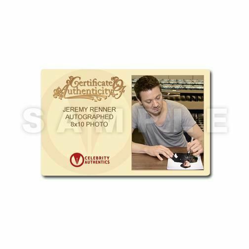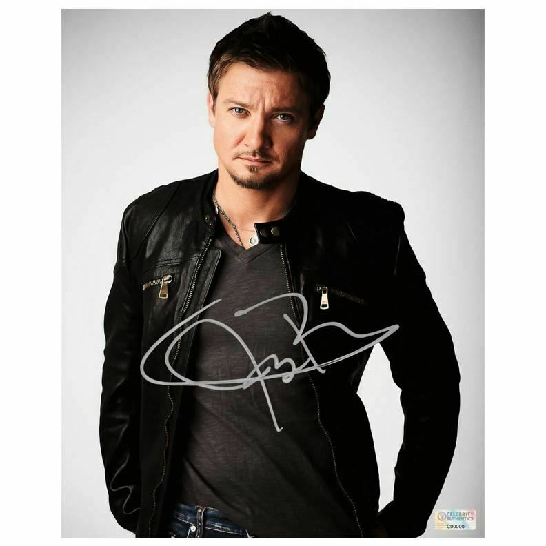 This 8x10 studio photo of Jeremy Renner has been personally hand-signed by Jeremy during his autograph signing with Celebrity Authentics. Item ships affixed with Celebrity Authentics serial-numbered and tamper evident Authentication Hologram and includes Celebrity Authentics Certificate of Authenticity featuring picture of Jeremy signing the photo. Please note: with multiples signed by the actor, a sample photo is used from stock to represent what you will receive. Exact autograph size and placement may vary.