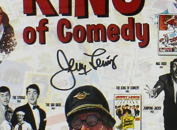 A Framed 16x20 The King of Comedy Collage Photo hand signed by Jerry Lewis. The item and signature are in excellent condition. The frame measures approximately 28"x24". Jerry Lewis was a legendary American comedian, actor, singer, filmmaker, and humanitarian. Rising to fame in the 1940s as part of the comedy duo Martin and Lewis with singer Dean Martin, he became known for his zany, slapstick humor and distinctive voice. After the duo split in 1956, Lewis went on to a successful solo career, starring in and directing a series of hit comedies, including The Bellboy and The Nutty Professor. AUTHENTICATION: The item is accompanied by a JSA Certificate of Authenticity - JSA Serial Numbered Hologram -