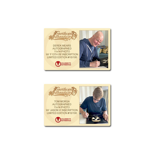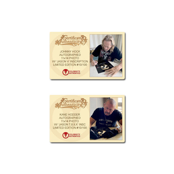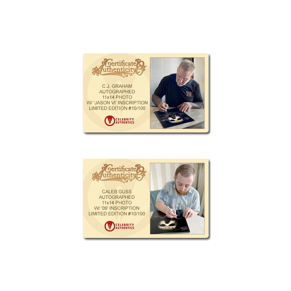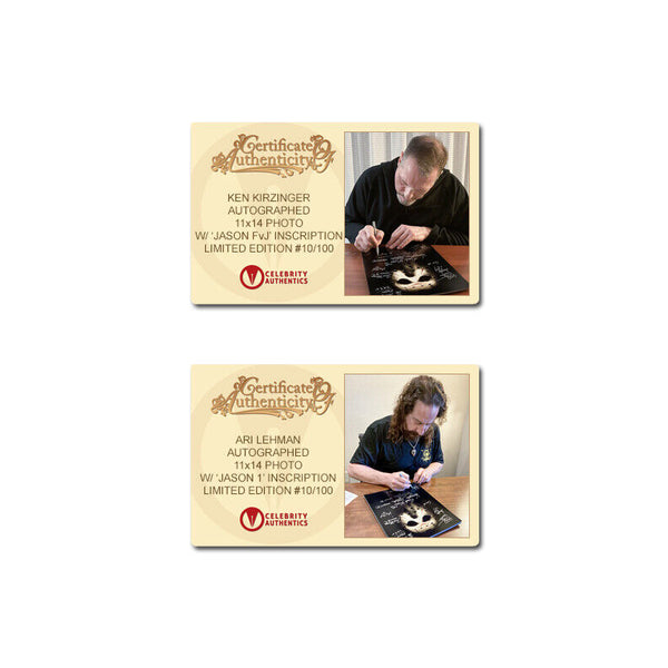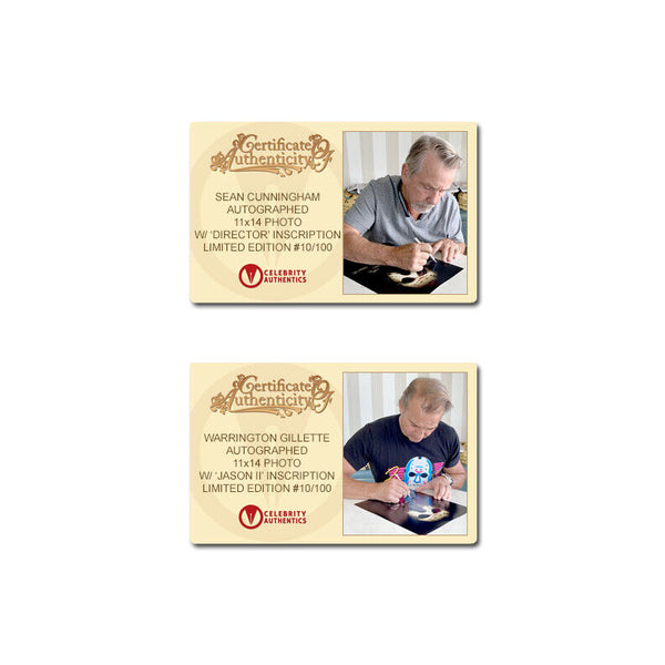 From the Framing Studios of Celebrity Authentics is this Limited Edition Jason Voorhees 11x14 Framed Photo (approximately 30"x25" framed) personally hand-signed by 10 of the actors who portrayed the iconic maniacal killer Jason Voorhees Kane Hodder, Derek Mears, Warrington Gillette, C.J Graham, Caleb Guss, Johnny Hock, Ken Kirzinger, Ari Lehman, Tom Morga, Douglas Tait and creator/director Sean Cunningham during their signings with Celebrity Authentics. Each photo is framed with a thematic weathered frame and features an actual piece of the dock used in the filming of the 1980 Friday The 13th! Ships affixed with the Celebrity Authentics serial-numbered and tamper evident Authentication Hologram and includes Celebrity Authentics Certificates of Authenticity featuring picture of each signing photo. Also includes a Celebrity Authentics Letter of Authenticity hand-signed by Ari Lehman certifying the Dock's on screen use.Framing: Photo is meticulously dry mounted and framed using acid free backing and mat boards with white core for the finest in presentation. UV protective glass with precision cut moulding are used for smooth, clean frame edges, hand assembled in our studio. Additionally, a protective back cover is used to seal the piece with corner bumpers applied to protect your walls, providing adequate air flow. A hanger is affixed to complete the finished collectible. Each framed photo is carefully wrapped for shipping with double protective corners and cushioning to help ensure the item's safe arrival. Celebrity Authentics Framing Studios - acclaimed as the industry's finest!Please note: with multiples signed by the actor, a sample photo is used from stock to represent what you will receive. Exact autograph size and placement may vary.