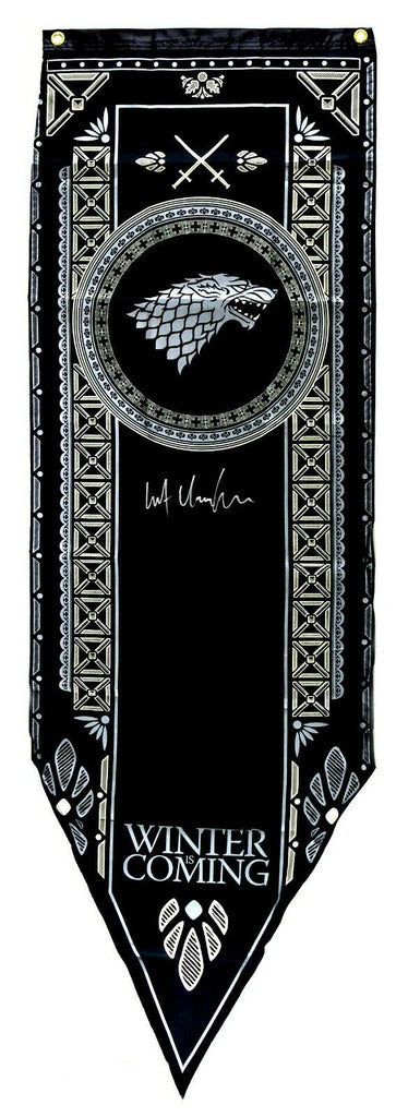 A Game of Thrones 18x60 Banner - House Stark Hand Signed by Kit Harington. The item and signature are in excellent condition. Harington rose to prominence for his breakthrough role as Jon Snow in the HBO television series Game of Thrones, which brought him international recognition. He has been nominated for a Primetime Emmy Award for Outstanding Supporting Actor in a Drama Series and a Critics Choice Television Awards for Best Supporting Actor in a Drama Series. AUTHENTICATION: The item is accompanied by a Certificate of Authenticity and Databased Hologram
