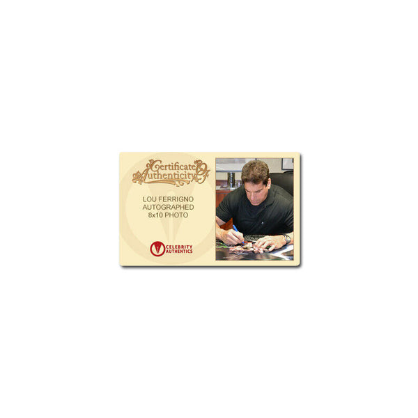 This 8x10 photo from the classic television series, The Incredible Hulk has been personally hand-signed by the Green Goliath himself, Lou Ferrigno during his signing with Celebrity Authentics. Dr. David Banner is a widowed scientist caught in the middle of an experiment gone bad. As a result, whenever Banner gets extremely upset or stressed out, he turns into a huge green monster called the Incredible Hulk, with awesome strength and rage to match. To keep from being discovered, Banner lives a nomadic life, traveling from town to town in search of a cure and helping people where he can, all the while trying to avoid suspicious reporter Jack McGee, who wants to expose Banner and the Hulk. "Don't make me angry. You wouldn't like me when I'm angry," Banner warns McGee in more than one episode. Rare signed shot ships affixed with Celebrity Authentics serial-numbered and tamper evident Authentication Hologram and includes Celebrity Authentics Certificate of Authenticity featuring picture of Lou signing photo. Please note: with multiples signed by the actor, a sample photo is used from stock to represent what you will receive. Exact autograph size and placement may vary.
