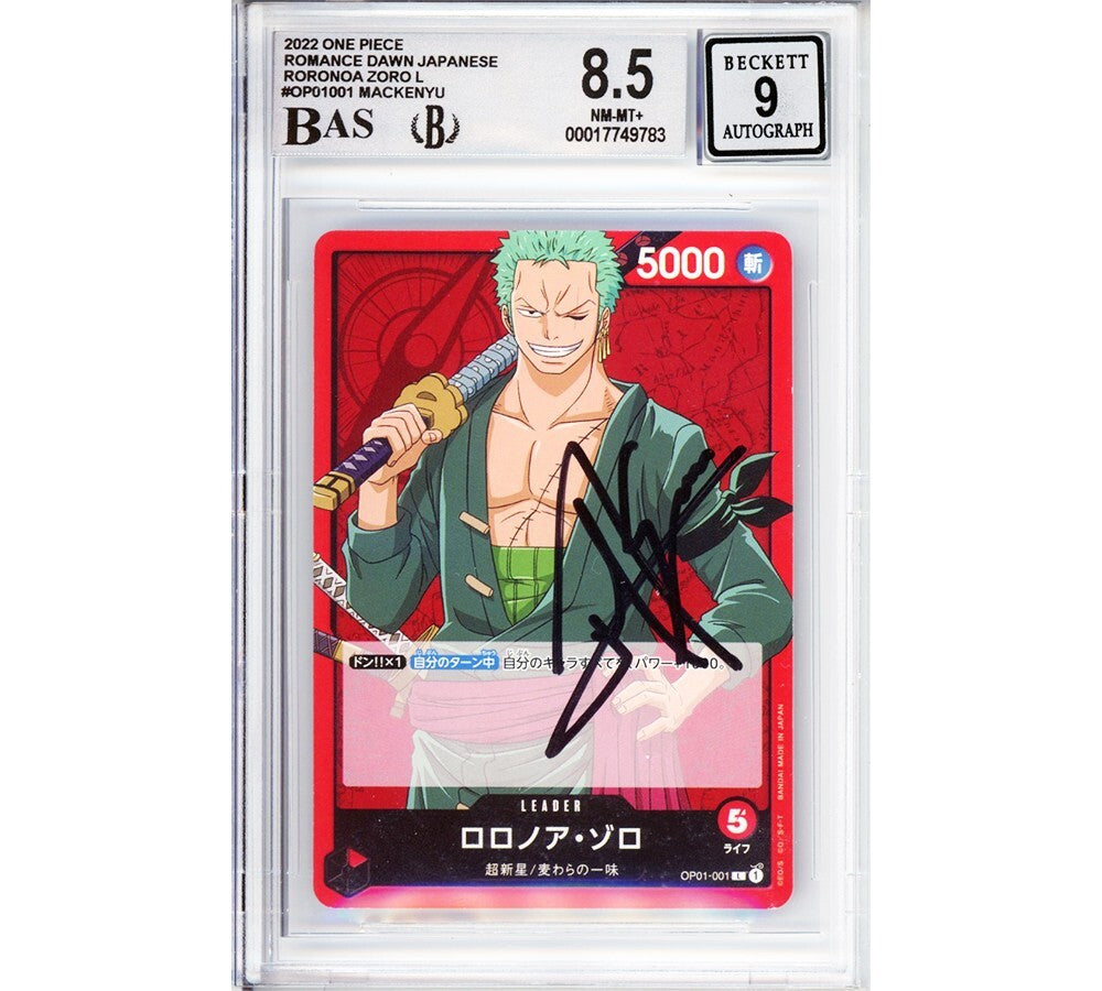 A One Piece Roronoa Zoro Supernovas Straw Hat Crew OP01-001-Japanese Graded Encapsulated Game Card hand signed by Mackenyu. The item and signature are in excellent condition and have received a Raw Grade of 8.5 NM MT+ and Auto Grade 9. AUTHENTICATION: The item is encapsulated in a tamper-evident case with a Beckett databased serial number.