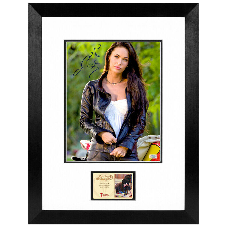 From the Framing Studios of Celebrity Authentics is this 8"x10" Framed Photo (approximately 18"x14" finished) of Mikaela from Transformers, personally hand-signed by Megan Fox during her signing with Celebrity Authentics. Ships affixed with the Celebrity Authentics serial-numbered and tamper evident Authentication Hologram and includes Celebrity Authentics Certificate of Authenticity featuring picture of Megan signing photo. Please note, due to their packaging, to help ensure their safe delivery we are unable to combine framed photos with other items. Stock image used for product images. Item ships with clean, unsmudged autograph in similar location. Photo is meticulously dry mounted and framed using acid free backing and mat boards with white core for the finest in presentation. UV protective glass with precision cut moulding are used for smooth, clean frame edges, hand assembled in our studio. Additionally, a protective back cover is used to seal the piece with corner bumpers applied to protect your walls, providing adequate air flow. A hanger is affixed to complete the finished collectible. Each framed photo is carefully wrapped for shipping with double protective corners and cushioning to help ensure the item's safe arrival. Celebrity Authentics Framing Studios - acclaimed as the industry's finest! Please note: with multiples signed by the actor, a sample photo is used from stock to represent what you will receive. Exact autograph size and placement may vary.
