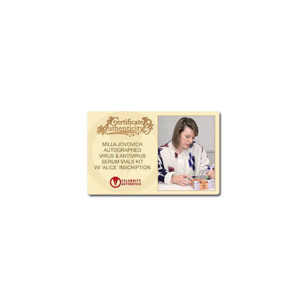 Celebrity Authentics is the exclusive autograph partner of Milla Jovovich. Please be aware most other online autographs purported to be Ms. Jovovich's are forgeries. Ms. Jovovich has only signed with Celebrity Authentics so be sure the item you choose is affixed with the Celebrity Authentics Authentication Hologram for his genuine signature.This Resident Evil 6" T-Virus & G-Vaccine Prop Replica Set with Case has been personally autographed by Milla Jovovich who also added her character name 'Alice' during her signing with Celebrity Authentics. Warning! Extinction-level pandemic serum vials inside! This replica prop set of Resident Evil-themed capsules includes one mutant inducing T-Virus (blue) and the antidote, the G-Vaccine. Each durable plastic vial measures approximately 6 inches tall. Replicas ship in an attractive tin window box affixed with Celebrity Authentics serial-numbered Authentication hologram and includes Celebrity Authentics Certificate of Authenticity featuring picture of Milla signing the case. A fantastic collection piece!Please note: with multiples signed by the actor, a sample photo is used from stock to represent what you will receive. Exact autograph size and placement may vary.