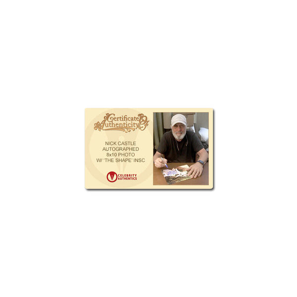 This 8x10 scene photo of Michael Myers from Halloween has been personally hand-signed by Nick Castle during his signing with Celebrity Authentics. On a cold Halloween night in 1963, six year old Michael Myers brutally murdered his 17-year-old sister, Judith. He was sentenced and locked away for 15 years. But on October 30, 1978, while being transferred for a court date, a 21-year-old Michael Myers steals a car and escapes Smith's Grove. He returns to his quiet hometown of Haddonfield, Illinois, where he looks for his next victims. Ships affixed with Celebrity Authentics serial-numbered and tamper evident Authentication Hologram and includes Celebrity Authentics Certificate of Authenticity featuring picture of Nick signing photo. Please note: with multiples signed by the actor, a sample photo is used from stock to represent what you will receive. Exact autograph size and placement may vary.