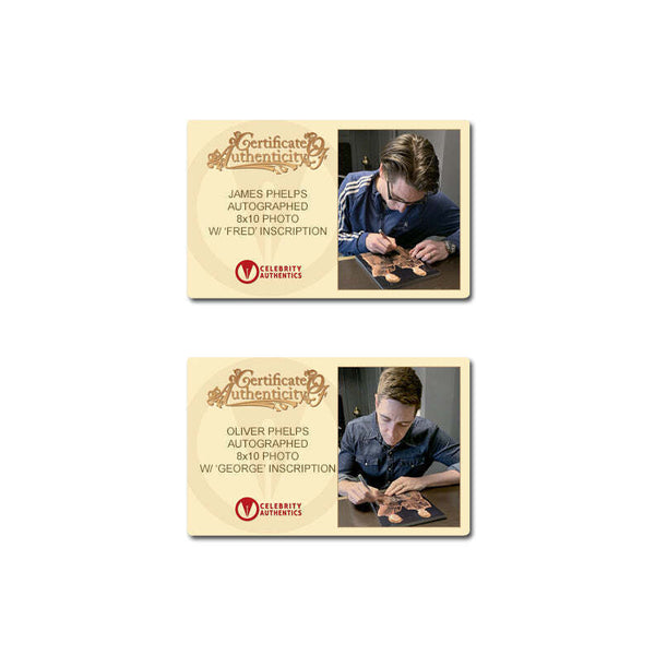 This 8x10 photo of Fred and George Weasley from the Harry Potter franchise has been personally hand-signed by both Oliver and James Phelps during their signings with Celebrity Authentics. Photo ships affixed with Celebrity Authentics serial-numbered and tamper evident Authentication Hologram and includes Celebrity Authentics Certificates of Authenticity featuring picture of each signing photo. Photo is meticulously dry mounted and framed using acid free backing and mat boards with white core for the finest in presentation. UV protective glass with precision cut moulding are used for smooth, clean frame edges, hand assembled in our studio. Additionally, a protective back cover is used to seal the piece with corner bumpers applied to protect your walls, providing adequate air flow. A hanger is affixed to complete the finished collectible. Each framed photo is carefully wrapped for shipping with double protective corners and cushioning to help ensure the item's safe arrival. Celebrity Authentics Framing Studios - acclaimed as the industry's finest! Please note: with multiples signed by the actor, a sample photo is used from stock to represent what you will receive. Exact autograph size and placement may vary.