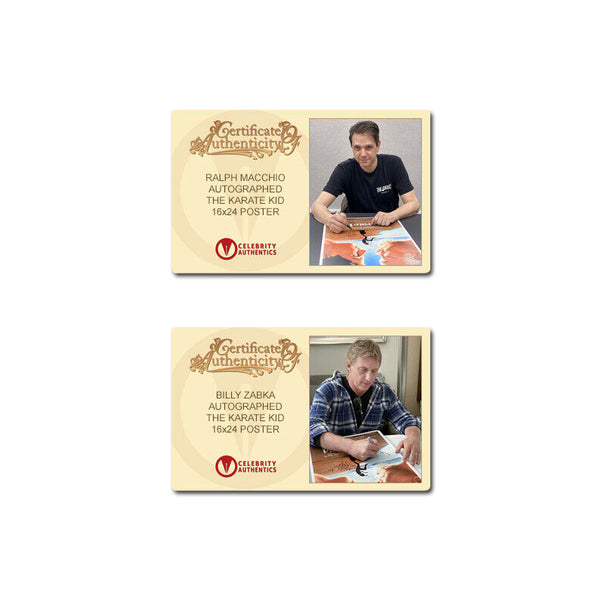 This 16x24 Karate Kid Movie Poster has been personally autographed by film stars Ralph Macchio and Billy Zabka during their signings with Celebrity Authentics. Daniel (Ralph Macchio) moves to Southern California with his mother, Lucille (Randee Heller), but quickly finds himself the target of a group of bullies who study karate at the Cobra Kai dojo. Fortunately, Daniel befriends Mr. Miyagi (Noriyuki "Pat" Morita), an unassuming repairman who just happens to be a martial arts master himself. Miyagi takes Daniel under his wing, training him in a more compassionate form of karate and preparing him to compete against the brutal Cobra Kai. Ships affixed with Celebrity Authentics serial-numbered and tamper evident Authentication hologram and includes Celebrity Authentics Certificates of Authenticity featuring picture of Ralph and Billy signing poster.Framing: Photo is meticulously dry mounted and framed using acid free backing and mat boards with white core for the finest in presentation. UV protective glass with precision cut moulding are used for smooth, clean frame edges, hand assembled in our studio. Additionally, a protective back cover is used to seal the piece with corner bumpers applied to protect your walls, providing adequate air flow. A hanger is affixed to complete the finished collectible. Each framed photo is carefully wrapped for shipping with double protective corners and cushioning to help ensure the item's safe arrival. Celebrity Authentics Framing Studios - acclaimed as the industry's finest!Please note: with multiples signed by the actor, a sample photo is used from stock to represent what you will receive. Exact autograph size and placement may vary.