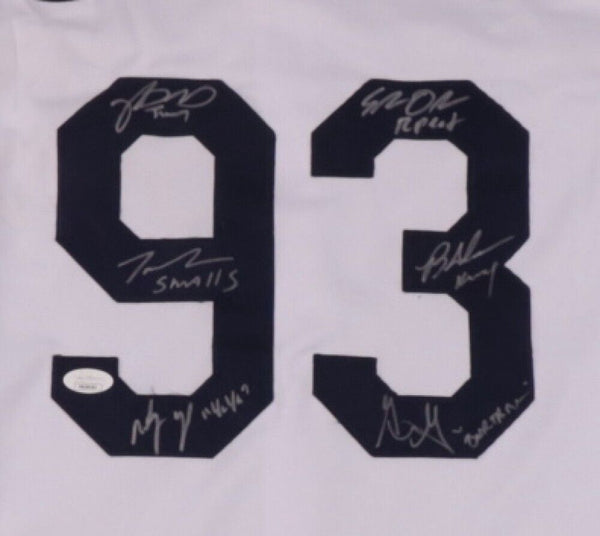 Custom on-field style jersey. Everything is sewn on, size XL. Has been hand-signed and inscribed by (6) including Tom Guiry (Scotty Smalls), Chauncey Leopardi (Michael 'Squints' Palledorous), Marty York (Alan "Yeah-Yeah" McClennan), Shane Obedzinski (Tommy 'Repeat' Timmons), Victor DiMattia (Timmy Timmons), and Brandon Adams (Kenny DeNunez).The lot / autograph(s) includes an official James Spence Authentication (JSA) hologram and matching COA for authenticity purposes. The signing of this item was witnessed by JSA.Authentication: JSA COA
