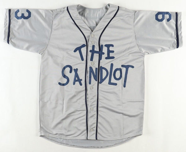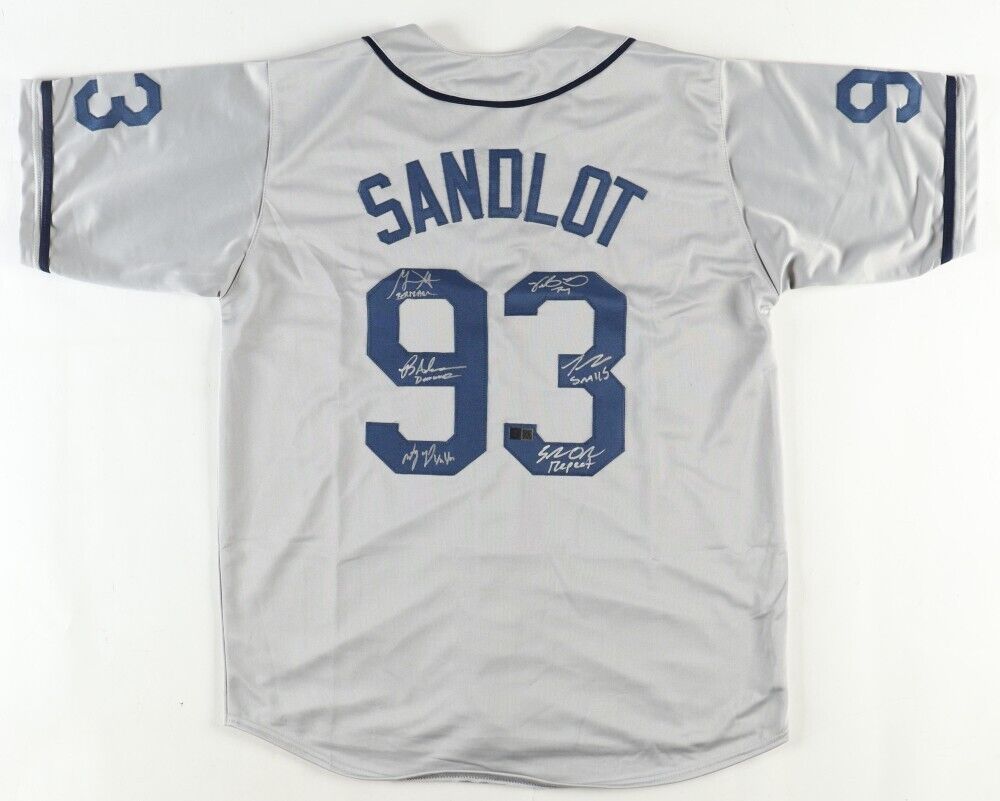 Custom on field style jersey with everything sewn on, size XL. Hand-signed and inscribed by Tom Guiry (Scotty Smalls), Victor DiMattia (Timmy Timmons), Marty York (Alan "Yeah-Yeah" McClennan), Shane Obedzinski (Tommy 'Repeat' Timmons), Grant Gelt (Bertram Grover Weeks) and Brandon Adams (Kenny DeNunez).The lot / autograph(s) includes an official Total Sports Enterprises (TSE) hologram for authenticity purposes.Authentication: Total Sports Enterprises Hologram