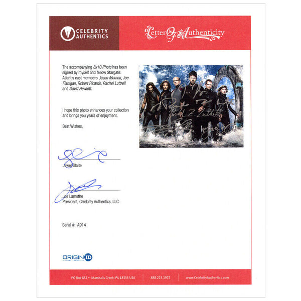 This Stargate Atlantis 8x10 Photo has been personally autographed in silver by the six lead cast members including Jason Momoa, Jewel Staite, Joe Flanigan, Rachel Luttrell, Robert Picardo and David Hewlett. Within the ruins of the legendary city of Atlantis is buried a secret base left by the Ancients, originators of the Stargate. A new team of explorers travels to the distant galaxy where Atlantis is located, where a primitive human civilization is threatened by a sinister enemy. Includes Celebrity Authentics Letter of Authenticity personally hand-signed by Jewel Staite verifying the authenticity of signed photo. Very rare cast signed Stargate piece direct from a cast member!Please note: with multiples signed by the actor, a sample photo is used from stock to represent what you will receive. Exact autograph size and placement may vary.