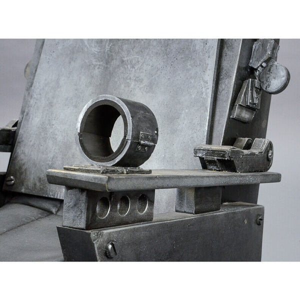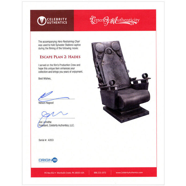 THIS ITEM IS AVAILABLE FOR PICK UP ONLY.Direct from the set is Sylvester Stallone's 2018 Escape Plan 2: Hades Screen Used Hero Restraining Chair! This is the chair used in all primary scene of Stallone being restrained and can be seen on the film's marketing and promotional posters and materials. As explained by the set decorator, only two chairs were produced (the other being destroyed) but only this one was affixed with rods into the back of the chair and features the plate screw marks on back. Customized, futuristic looking chair is made of resin, plastic, wood and leather, measuring approximately 47 inches tall, 29 inches wide, 40 inches deep and sits atop a custom base making an impressive and solid unit, weighing about 150 lbs. The faux metal finish is a work of art with magnetic wrist restraints. Ray Breslin manages an elite team of security specialists trained in the art of breaking people out of the world's most impenetrable prisons. When his trusted operative, Shu Ren, is kidnapped and disappears inside the most elaborate prison ever built, Ray assembles an elite team to assist in the rescue. This screen matched hero prop piece would be a focal point of any collection or museum! Includes the Celebrity Authentics Letter of Authenticity personally signed by Production Crew Member verifying item's on screen use and provenance. This item is tagged with Origin ID authentication and tracking DNA.