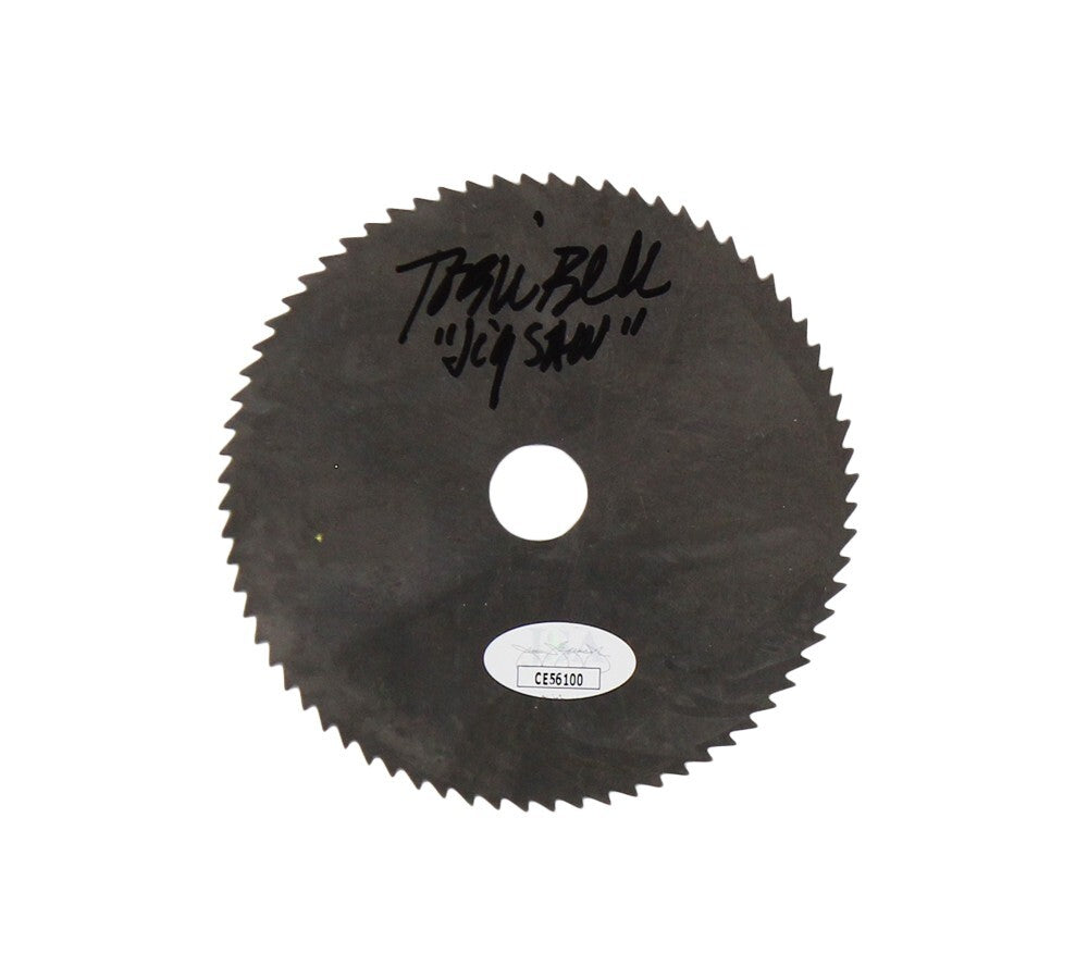 A Saw Movie Saw Blade hand signed by Tobin Bell. The item and signature are in excellent condition. In addition to signing his name, Tobin also inscribed "Jigsaw" on the item. AUTHENTICATION: The item is accompanied by a JSA Certificate of Authenticity - JSA Serial Numbered Hologram -
