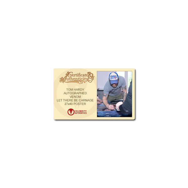 Celebrity Authentics is the exclusive autograph partner of Tom Hardy. Please be aware most other online autographs purported to be Mr. Hardy's are forgeries. Mr. Hardy has only signed with Celebrity Authentics so be sure the item you choose is affixed with the Celebrity Authentics Authentication Hologram for his genuine signature.This 2021 Venom: Let There Be Carnage Original 27x40 Double-Sided Final Style Movie Poster has been personally autographed by Tom Hardy during his exclusive signing with Celebrity Authentics. Eddie Brock is still struggling to coexist with the shape-shifting extraterrestrial Venom. When deranged serial killer Cletus Kasady also becomes host to an alien symbiote, Brock and Venom must put aside their differences to stop his reign of terror. Ships affixed with Celebrity Authentics serial-numbered Authentication hologram and includes Celebrity Authentics Certificate of Authenticity featuring picture of Tom signing poster. Please note: with multiples signed by the actor, a sample photo is used from stock to represent what you will receive. Exact autograph size and placement may vary.