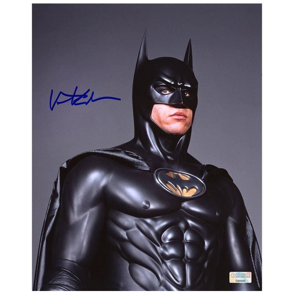 Celebrity Authentics was the exclusive autograph partner of Val Kilmer. Please be aware most other online autographs purported to be Mr. Kilmer's are forgeries. Mr. Kilmer has only signed with Celebrity Authentics so be sure the item you choose is affixed with the Celebrity Authentics Authentication Hologram for his genuine signature.This 8x10 studio photo from Batman Forever has been personally hand-signed by the late film legend, Val Kilmer during his signing with Celebrity Authentics. Batman (Val Kilmer) faces off against two foes: the schizophrenic, horribly scarred former District Attorney Harvey Dent, aka Two-Face (Tommy Lee Jones), and the Riddler (Jim Carrey), a disgruntled ex-Wayne Enterprises inventor seeking revenge against his former employer by unleashing his brain-sucking weapon on Gotham City's residents. As the caped crusader also deals with tortured memories of his parents' murder, he has a new romance, with psychologist Chase Meridian (Nicole Kidman). Ships affixed with Celebrity Authentics serial-numbered and tamper evident Authentication Hologram and includes Celebrity Authentics Certificate of Authenticity featuring picture of Val signing photo. Please note: with multiples signed by the actor, a sample photo is used from stock to represent what you will receive. Exact autograph size and placement may vary.