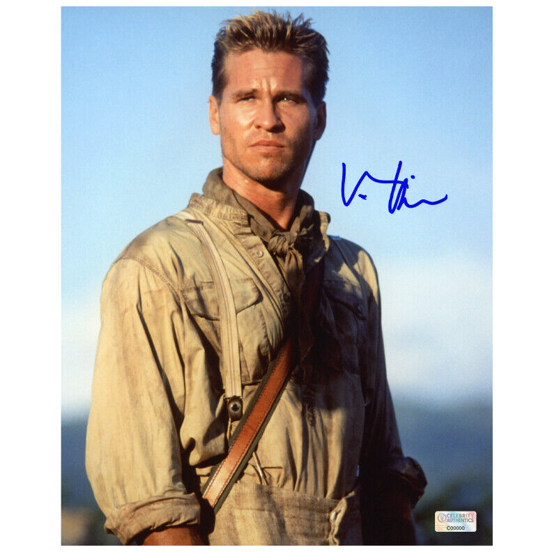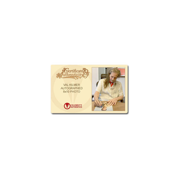 Celebrity Authentics was the exclusive autograph partner of Val Kilmer. Please be aware most other online autographs purported to be Mr. Kilmer's are forgeries. Mr. Kilmer has only signed with Celebrity Authentics so be sure the item you choose is affixed with the Celebrity Authentics Authentication Hologram for his genuine signature.This 8x10 photo of Col. John Henry Patterson from Ghost and the Darkness has been personally hand-signed signed by late film legend, Val Kilmer during his autograph signing with Celebrity Authentics. Sir Robert Beaumont (Tom Wilkinson) is behind schedule on a railroad in Africa. Enlisting noted engineer John Henry Patterson (Val Kilmer) to right the ship, Beaumont expects results. Everything seems great until the crew discovers the mutilated corpse of the project's foreman (Henry Cele), seemingly killed by a lion. After several more attacks, Patterson calls in famed hunter Charles Remington (Michael Douglas), who has finally met his match in the bloodthirsty lions. Ships affixed with Celebrity Authentics serial-numbered and tamper evident Authentication Hologram and includes Celebrity Authentics Certificate of Authenticity featuring picture of Val signing photo. Please note: with multiples signed by the actor, a sample photo is used from stock to represent what you will receive. Exact autograph size and placement may vary.