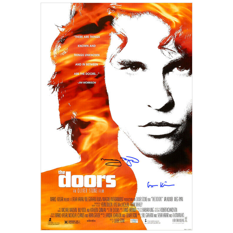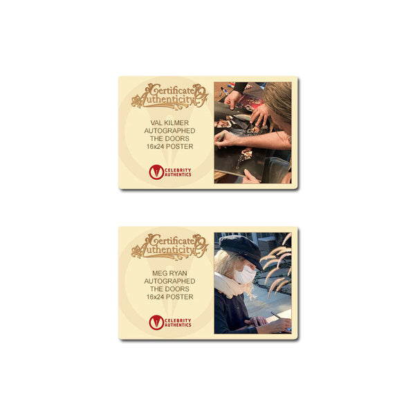 Celebrity Authentics was the exclusive autograph partner of Val Kilmer. Please be aware most other online autographs purported to be Mr. Kilmer's are forgeries. Mr. Kilmer has only signed with Celebrity Authentics so be sure the item you choose is affixed with the Celebrity Authentics Authentication Hologram for his genuine signature.This rare 1991 The Doors 16x24 Movie Poster has been personally hand-signed by late film legend Val Kilmer and icon Meg Ryan during their signings with Celebrity Authentics. After a psychedelic experience in the California desert, Jim Morrison (Val Kilmer), lead singer of The Doors, and his bandmates begin performing in Los Angeles and quickly become a sensation. However, when Jim begins ditching his musical responsibilities and his girlfriend, Pamela (Meg Ryan), in favor of his dangerous addictions and the affections of the seductive, occult-obsessed Patricia (Kathleen Quinlan), the band starts to worry about their leader. Ships affixed with the Celebrity Authentics serial-numbered and tamper evident Authentication Hologram and includes Celebrity Authentics Certificates of Authenticity featuring a picture of Val and Meg signing. Please note: with multiples signed by the actor, a sample photo is used from stock to represent what you will receive. Exact autograph size and placement may vary.