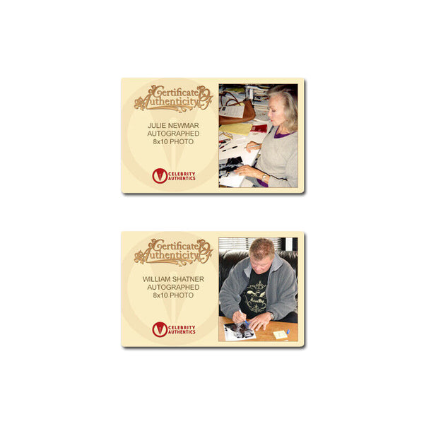 This very rare 8x10 photo of Captain Kirk and Eleen from the classic Star Trek Series has been personally hand-signed by pop culture icons William Shatner and Julie Newmar during their signings with Celebrity Authentics. The Federation clashes with the Klingon Empire on Capella IV when a sudden coup forces Kirk's landing party to flee into the hills with the now dead leader's pregnant wife in this episode. Ships affixed with Celebrity Authentics serial-numbered and tamper evident Authentication Hologram and includes Celebrity Authentics Certificates of Authenticity featuring picture of William and Julie signing photo. Great collection piece! Please note: with multiples signed by the actor, a sample photo is used from stock to represent what you will receive. Exact autograph size and placement may vary.