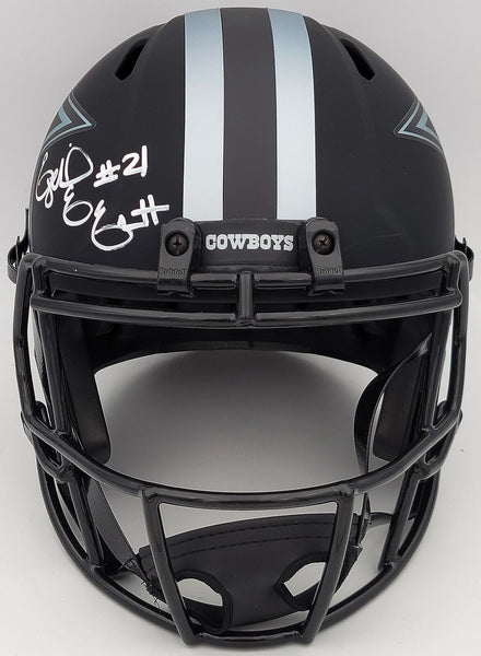 This is a Dallas Cowboys Eclipse Black Full Size Replica Speed Helmet that has been hand signed by Ezekiel Elliott. The Eclipse helmets are delicate and may have some marks or scratches on them. This item has been certified authentic by Beckett Authentication (BAS) and comes with their tamper-proof QR Code sticker that can be verified on the Beckett-authentication.com.